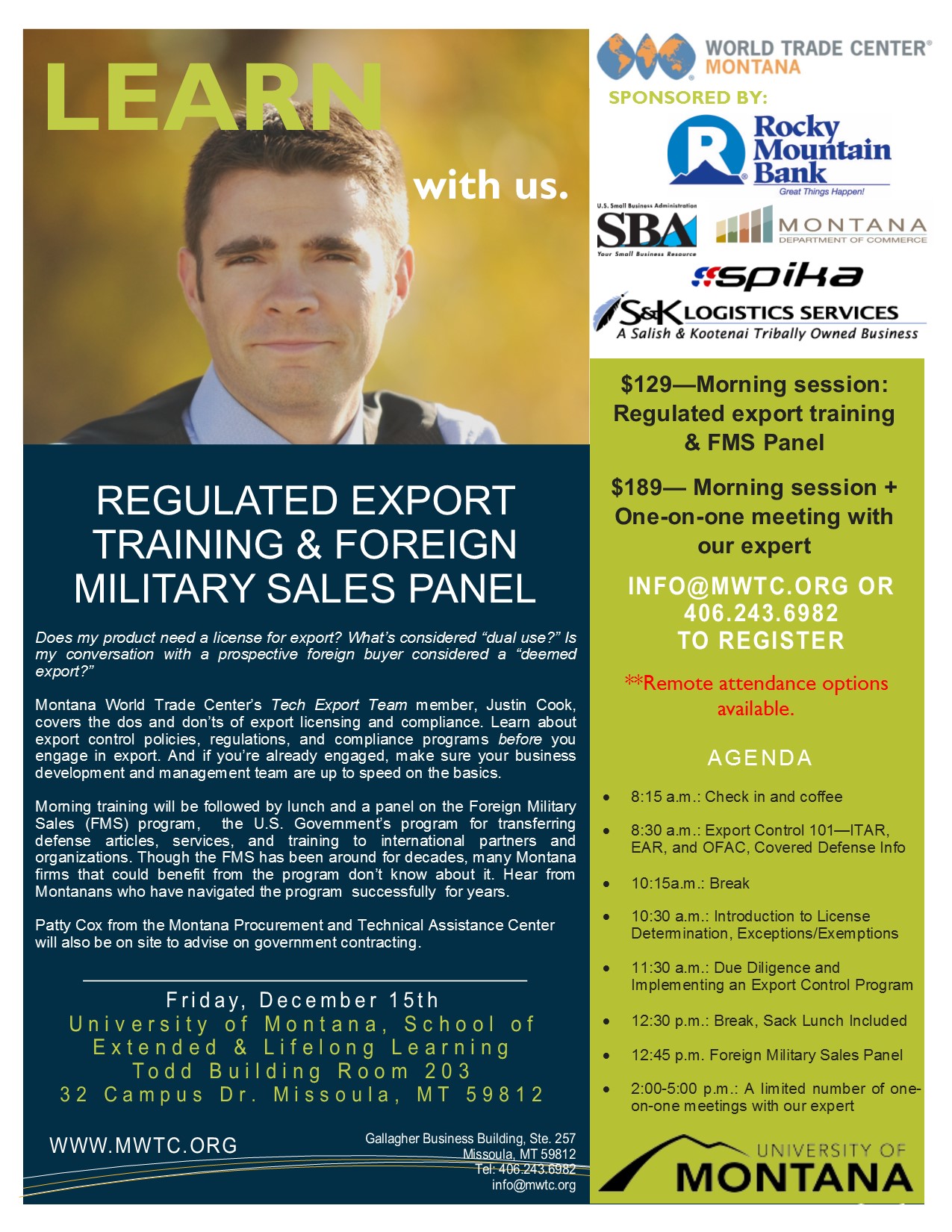 Morning training will be followed by lunch and a panel on the Foreign Military Sales (FMS) program, the U.S. Government’s program for transferring defense articles, services, and training to international partners and organizations. Though the FMS has been around for decades, many Montana firms that could benefit from the program don’t know about it. Hear from Montanans who have navigated the program successfully for years.